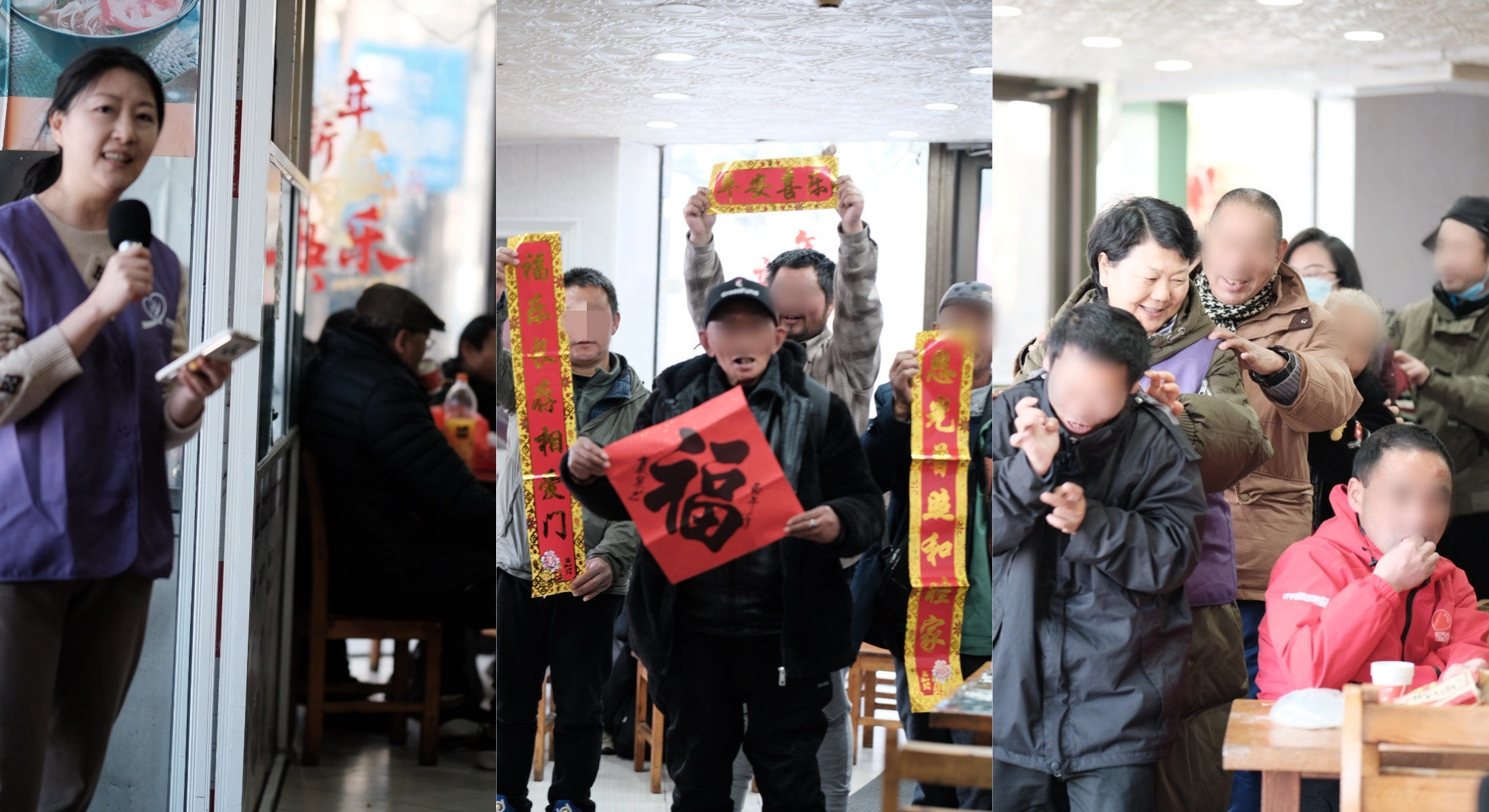 上午9:20,志愿者们准时集合,迅速进入分工协作状态。现场采取流水线方式完成福袋装配与午餐打包,并同步布置签到区域。街友们到达时间较早,活动尚未正式开始,互动已自然展开。在筹备过程中,志愿者邀请街友共同参与节目分享与互动。现场有街友主动献唱,也有街友拿出对自己而言十分珍贵的春联,作为新年祝福赠与大家,氛围温暖而真诚。