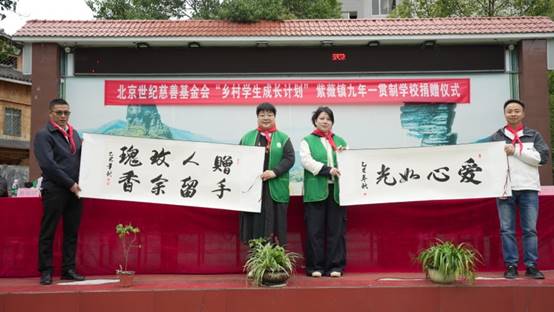 北京世纪慈善基金会副理事长兼秘书长王璐,项目人员张超颖,杭州诗色文具有限公司总经理刘妍熠,北京世纪慈善基金会鞍山照德公益基金王继红,印江县紫薇镇政府办公室主任龙林,紫薇镇中心校校长兼紫薇镇九年一贯制学校校长陈太伟,紫薇镇小学校长李太红,及全体师生参加活动。